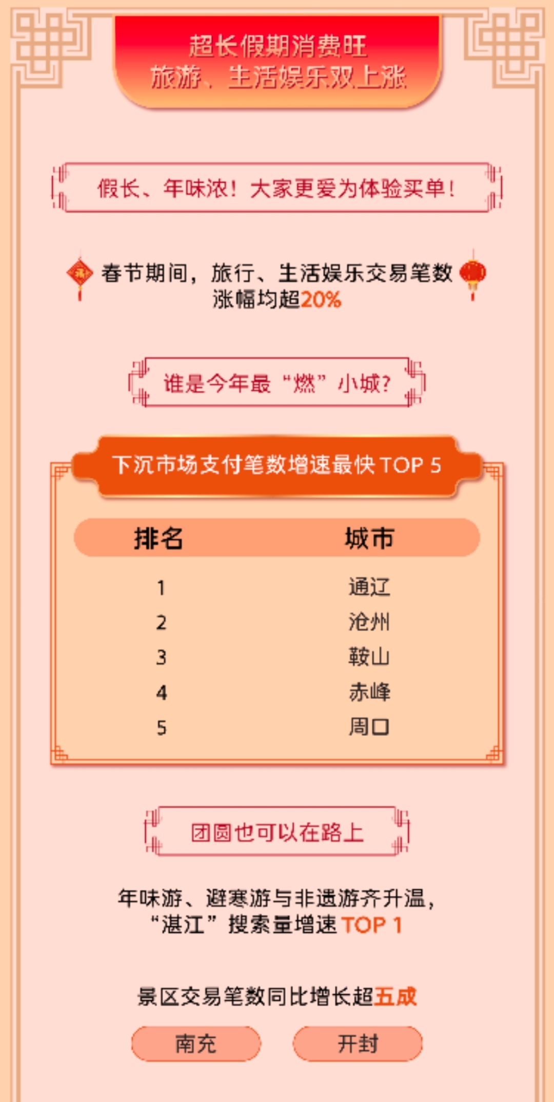 超长假期亦激发空前的出行需求。国内游方面, 年味游、避寒游及非遗游齐升温。数据显示,在旅游目的地中,四川南充市、河南开封市景区交易笔数同比增长超五成。海南封关运作叠加长假效应,春节期间,海南相关免税类小程序交易金额同比增长81%。