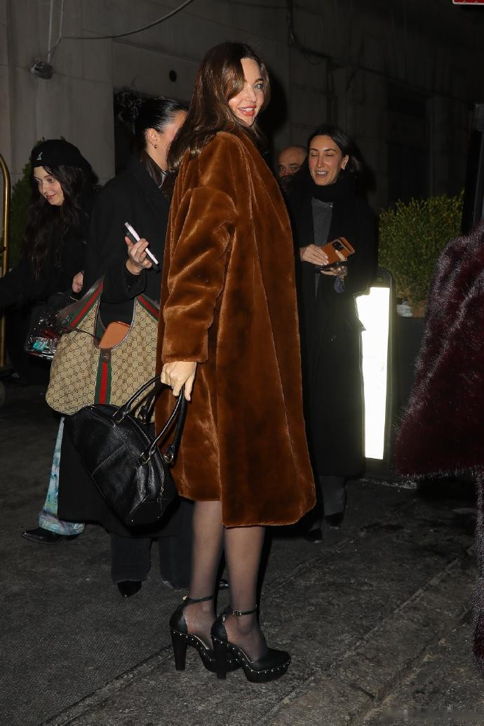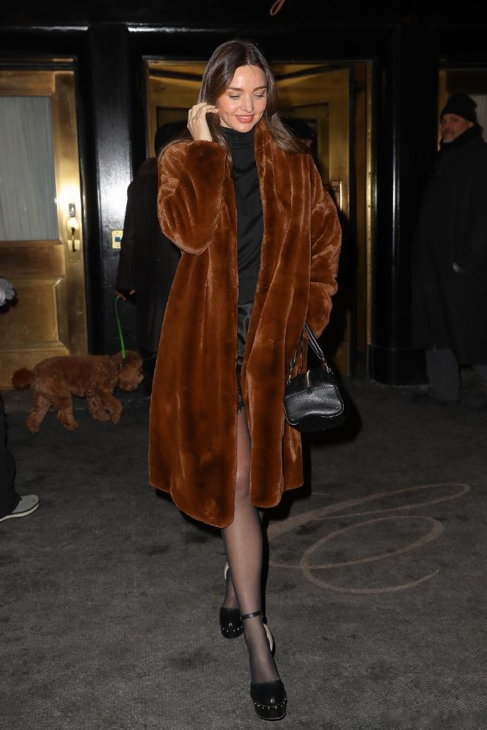 米兰达可儿在纽约外出离开离开Carlyle酒店,黑色短裙和棕色大衣时髦又低调!